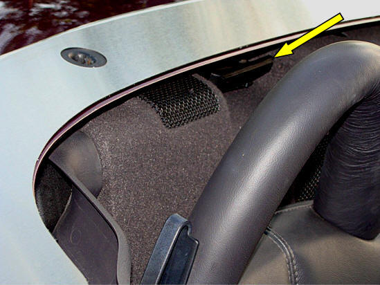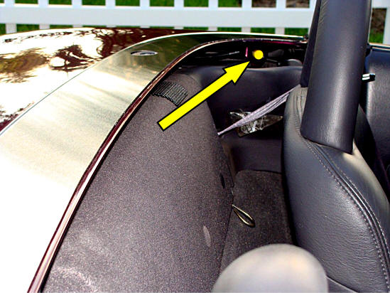 Pull handle lever out behind Passenger Seat. This releases the rear convertible top connectors.