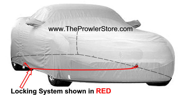 (Actual Cable is gray.) Cable loops through grommets' on both lays sides underneath car and locks. Fits all of our Prowler covers.