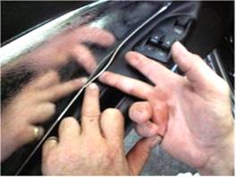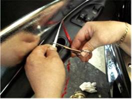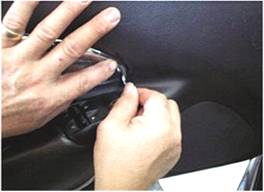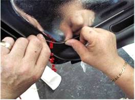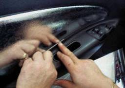 Photo 1 - Apply the accelerator agent (included) Photo 2 - Start the outer trim as shown. around the edge of the door panel carefully.